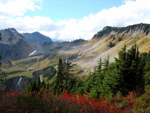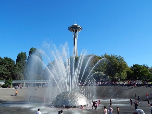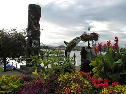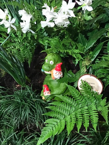 A dinosaur and gnomes at the NW Flower & Garden Show