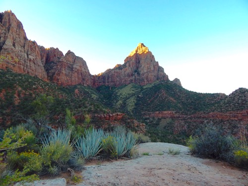 The Watchman Mountain peak at sunset